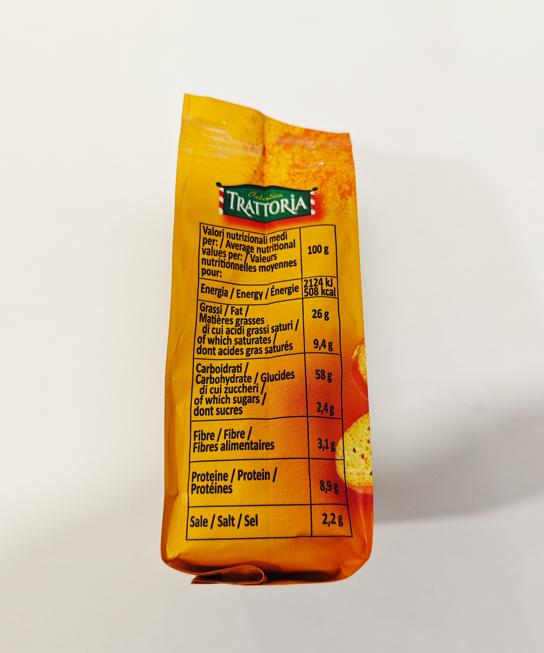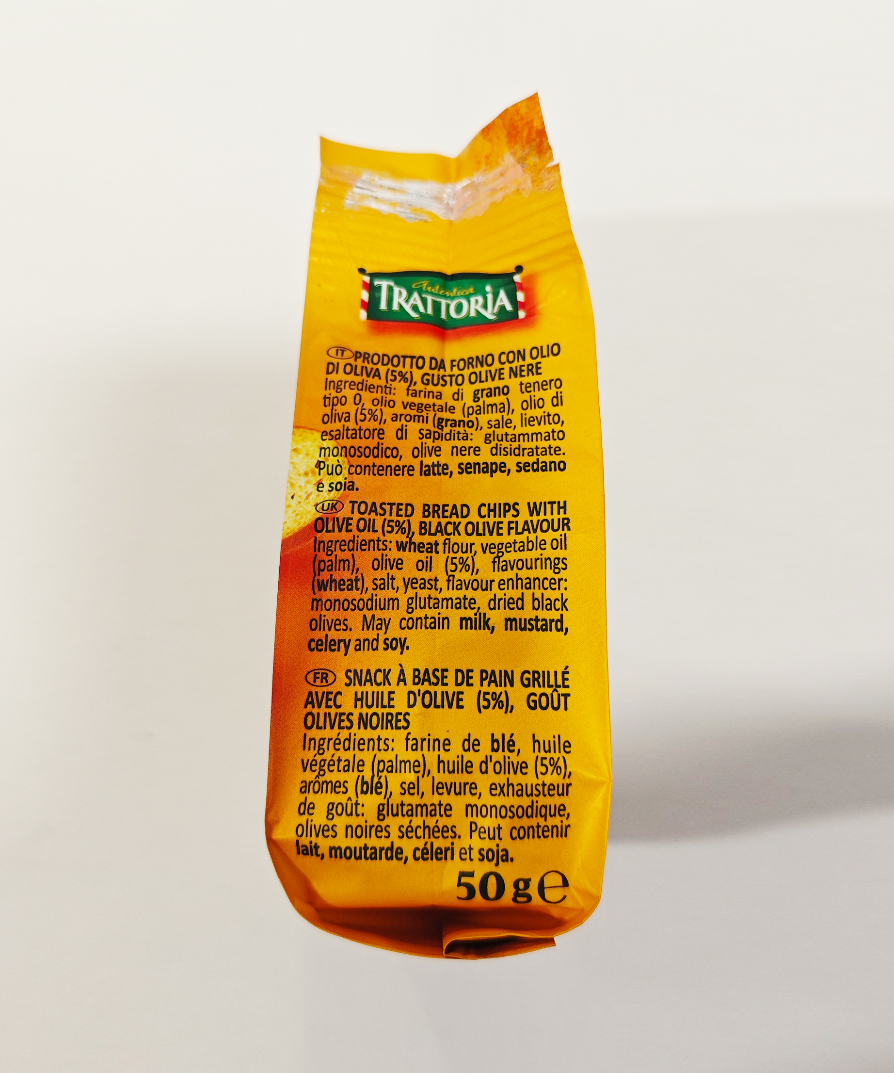 Ingredienti: Farina di grano tenero tipo 0,Olio vegetale (palma),Olio di oliva (5%), Aromi (grano) ,Sale,Lievito,Esaltatore di sapidità: glutammato monosodico. Olive nere disidratate. Può contenere tracce di latte, senape, sedano e soia.